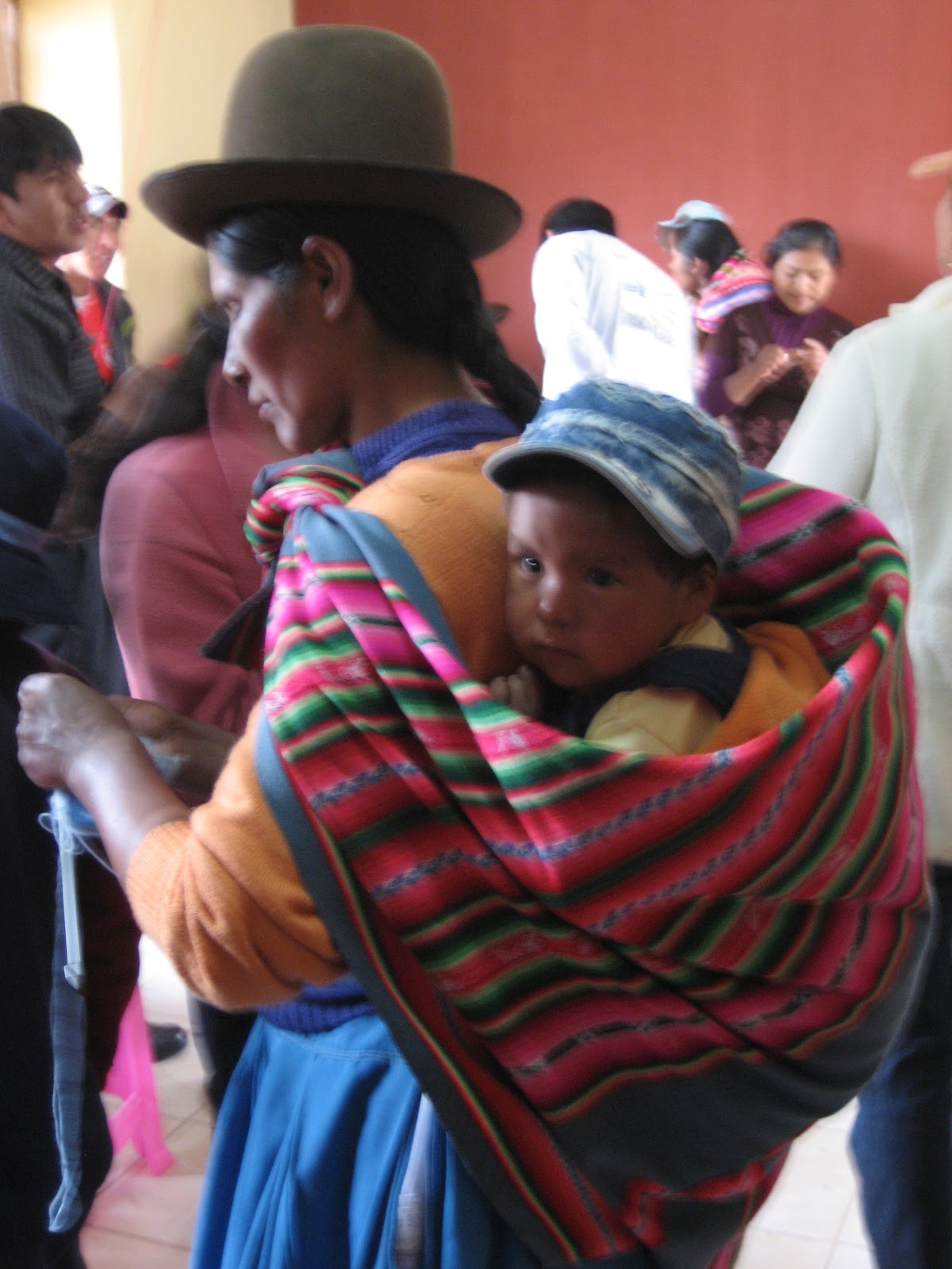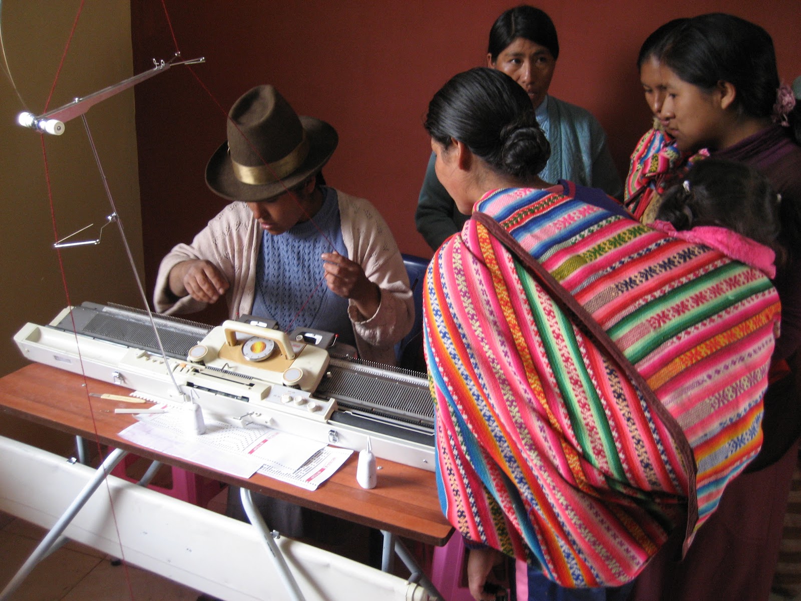 plastic stools stood at each work station and a length of half-finished sweater material was stretched on one of the machines. A mamita who had seen our arrival and welcomed us through the door turned on a loudspeaker in the corner and commenced a lengthy announcement in Quechua. I only understood one word in Spanish that was projected throughout the village--"apurensen"--hurry up everyone! Within a matter of moments the small room was filled with women, children, infants, men and even the village dogs . . . all coming to check out what was happening in the community room and to say hello to Rosa, their benefactor.