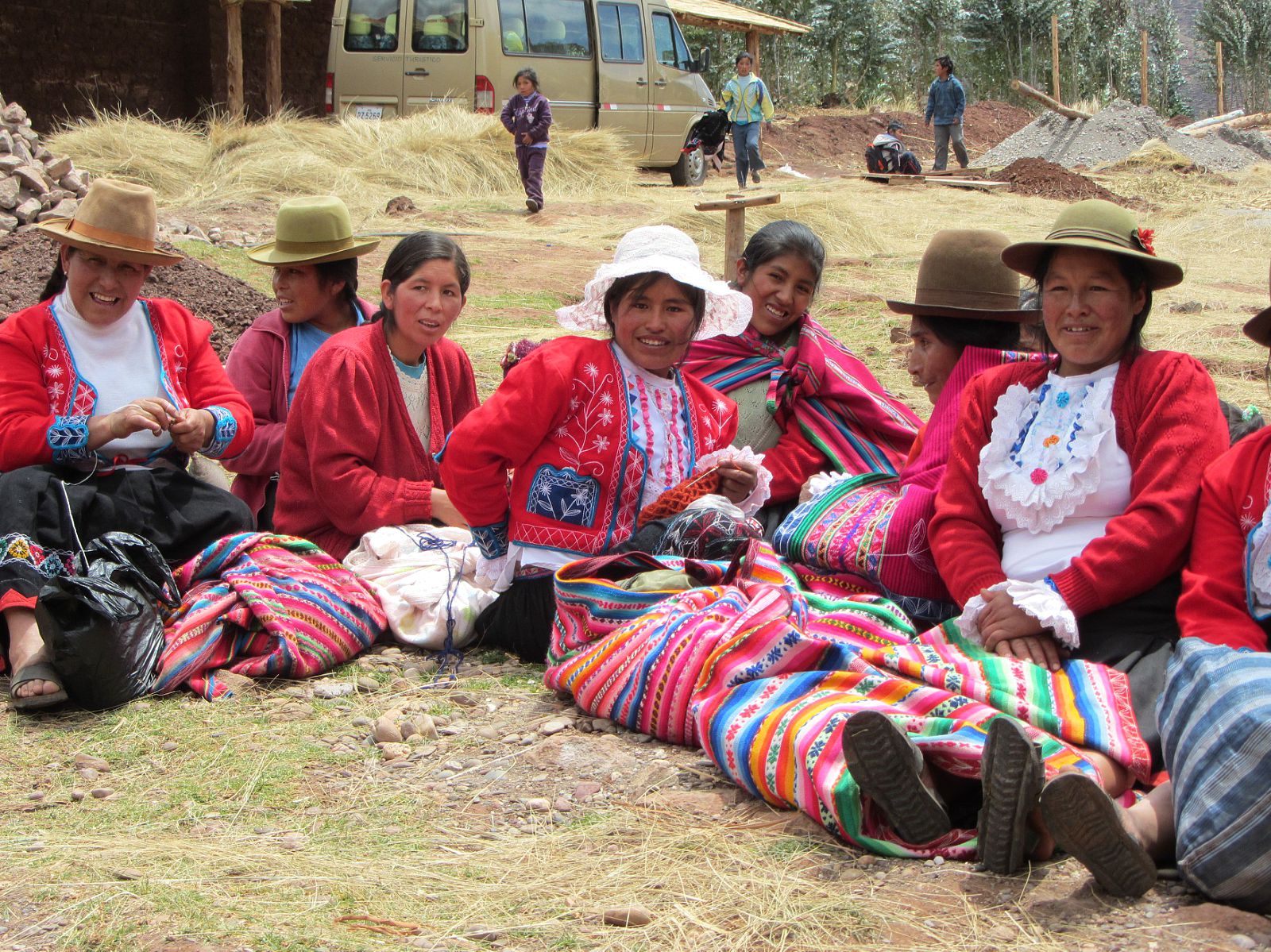As we returned to our bus, I walked arm in arm with one of the mamitas telling her how very grateful I am for all their generosity, how I will never forget how warm-hearted and "muy amable" everyone in her community is and how much love I feel for them. Just before we stepped onto the bus they gifted us each a handmade knitted scarf. The two musicians played another tune and we waved through the windows as we rolled away. Just up the road we passed a group of workers including several mamitas whose bowler hats had been replaced by bright yellow hardhats, moving stones for the foundation of another structure related to their textile exhibition. On our way out of the town we stopped at their community room and emptied the last of the suitcases of donations. There were only a couple of men to help us unload . . . the rest of the village would find it all later and go through it themselves. I felt so much better about this kind of giving than the mass distribution of the villages yesterday. It is much more my style to give anonymously, leaving something to be discovered later as a surprise . . .