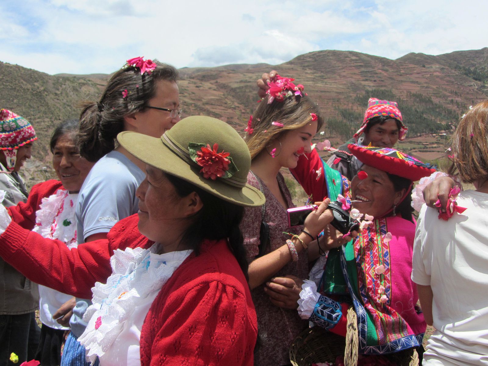 The women led us to a new structure that the whole village has been working on for some time . . . a spacious one-room adobe building with thatched roofing. They drew us inside and proudly gave us visual orientation as Percy explained: the village of Llaquepata decided to start a community-based ecotourism project. Within this building they plan to exhibit information about llamas and alpacas, about their history, their care, the steps involved in harvesting and processing their wool, demonstrations of how to spin and dye it, hands-on displays of the natural dyes they use to color the wool (different plants and wild herbs that grow around the village, seeds and soils/clay, insects, flowers and blossoms . . . a whole incredible range of beautiful earthy tones) and finally how they weave and knit the wool into beautiful handmade crafts. This is an art and skill that the people here have been practicing for countless generations. At the end of all this they had a small display of the items they will be producing to sell. Imagine us: a group of seven inspired women, so impressed by the project and by the beauty of their art, excited to be able to support them so directly . . . as the first group of visitors/customers, we gave them quite a day of business! Teresa even bought the hat that had been placed on her head when we danced in and then in a moment of inspiration asked one of the mamitas if there was perhaps one of their woolen skirts to buy . . . after one almost imperceptible moment of hesitation, the mamita giggled, took off her skirt, tied it around Teresa's waist and did a playful dance in her underskirts!